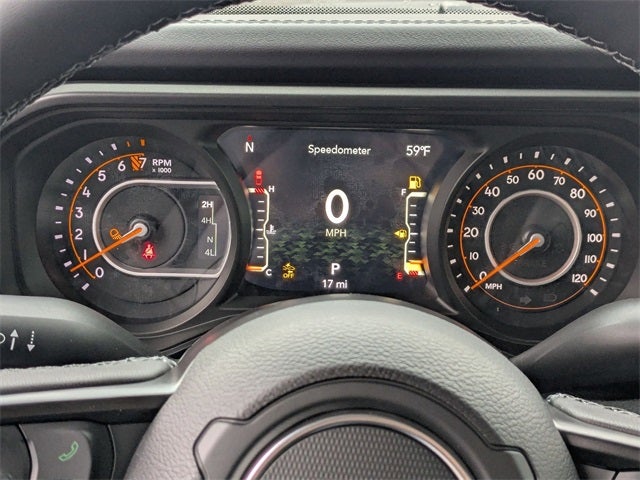 Well equipped with: LED Headlamp and Fog Lamp Group (Daytime Running Lamps LED Accents, Front LED Fog Lamps, and LED Premium Reflector Headlamps), Quick Order Package 24H Sahara (110 Mph Vehicle Max Speed Calibration, 2-Piece Body Color Fender Flares, Advanced Brake Assist, Air Conditioning with Auto Temp Control, Automatic Headlamps, Body Color 3-Piece Hard Top, Central ADAS Decision Module (CADM), Cluster 7.0 TFT Color Display, Corning Gorilla Glass, Daytime Running Lamp System, Deep Tint Sunscreen Windows, Emergency/Assistance Call, Freedom Panel Storage Bag, Front Door Locks 2-Door Passive Entry, Full Length Floor Console Premium Armrest, Full Speed Forward Collision Warning Plus, Hard Seat Back, Heated Front Seats, Heated Steering Wheel, Leather Wrapped Park Brake Handle, Leather Wrapped Shift Knob, Normal Duty Plus Suspension, Power 4-Way Driver Lumbar Adjust, Power 4-Way Passenger Lumbar Adjust, Power Adjust 8-Way Driver Seat, Power Adjust 8-Way Front Passenger Seat, Power Heated Mirrors, Premium Door Trim Panel, Premium McKinley Trimmed Seats, Premium Wrapped Steering Wheel, Rear Armrest with Cupholder Seat, Rear Sliding Window, Rear Window Defroster, Remote Start System, Sahara, Sahara Badge Neutral Gray, Security Alarm, Sun Visors with Illuminated Vanity Mirrors, Universal Garage Door Opener, and Wheels: 18 x 7.5 Machined/Painted Gray), Safety Group (Auto High Beam Headlamp Control, Blind Spot and Cross Path Detection, LED Taillamps, and ParkSense Rear Park Assist System), Trailer Tow and Auxiliary Switch Group (Auxiliary Switches, Class IV Receiver Hitch, Heavy-Duty Engine Cooling, and Trailer Hitch Zoom), 12.3 Touchscreen Display, 3.73 Rear Axle Ratio, 4-Wheel Disc Brakes, 4G LTE Wi-Fi Hot Spot, 8 Speakers, ABS brakes, Air Conditioning, Alexa Built-in, AM/FM radio: SiriusXM with 360L, Apple CarPlay, Apple CarPlay/Android Auto, Brake assist, Compass, Connectivity - US/Canada, Delay-off headlights, Driver door bin, Driver vanity mirror, Dual front impact airbags, Dual front side impact airbags, Electronic Stability Control, Front anti-roll bar, Front Bucket Seats, Front Center Armrest w/Storage, Front fog lights, Front License Plate Bracket, Front reading lights, Google Android Auto, Illuminated entry, Integrated roll-over protection, Low tire pressure warning, MOPAR Spray in Bedliner, MyFlexCare Service Plan, Normal Duty Suspension, Occupant sensing airbag, Outside temperature display, Overhead airbag, Panic alarm, ParkView Rear Back-Up Camera, Passenger door bin, Passenger vanity mirror, Power steering, Power windows, Radio data system, Radio: Uconnect 5 with 12.3 Display, Rear anti-roll bar, Rear reading lights, Remote keyless entry, Speed control, Split folding rear seat, Steering wheel mounted audio controls, Tachometer, Telescoping steering wheel, Tilt steering wheel, Traction control, Trip computer, USB Host Flip, Variably intermittent wipers, Voltmeter, and Wheels: 17 x 7.5 Black Steel Styled.
