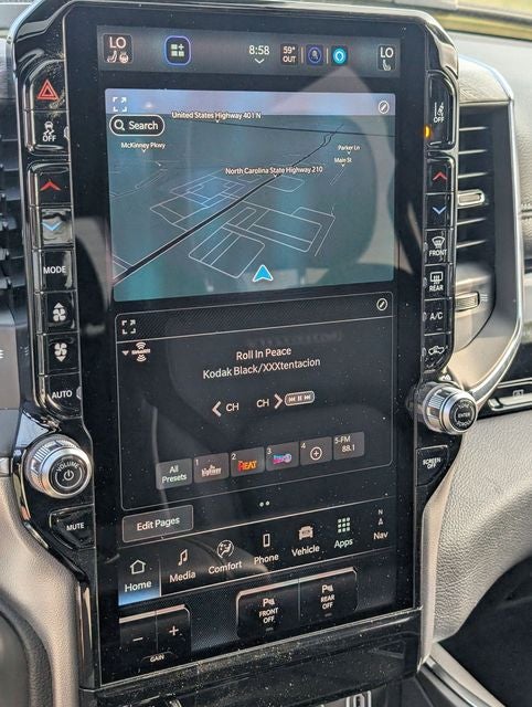 Well equipped with: Bed Utility Group (Exterior 115V AC Outlet, MOPAR 4 Adjustable Cargo Tie-Down Hooks, and MOPAR Spray in Bedliner), Laramie Level 2 Equipment Group (14.4 Touchscreen Display, 4G LTE Wi-Fi Hot Spot, Cluster 12 TFT Color Display, Connected Travel and Traffic Services, Connectivity - US/Canada, Front Passenger Interactive Display, GPS Navigation, Harman/Kardon 19 Speaker Premium Sound, Integrated Center Stack Radio, Integrated Voice Command with Bluetooth®, Power Tailgate, Radio: Uconnect 5 Nav with 14.4 Display, Rain Sensitive Windshield Wipers, SiriusXM Radio Service, SiriusXM with 360L, and USB Host Flip), Night Edition (Accent Color Door Handles, Accent Color Premium Power Mirrors, Accent Color Tailgate Handle, Anti-Spin Differential Rear Axle, Auto Power-Folding Mirrors, Auto-Dimming Exterior Driver Mirror, Black Exterior Truck Badging, Black Headlamp Bezels, Black Interior Accents, Black Painted Exterior Mirrors Caps, Black Tail Lamp Bezels, Body Color Front Bumper, Body Color Rear Bumper with Step Pads, Convex Wide-Angle Exterior Mirror Insert, Dual Exhaust with Black Tips, Exterior Mirrors Approach Lamps, Exterior Mirrors Courtesy Lamps, Exterior Mirrors with Heating Element, Exterior Mirrors with Memory, Exterior Mirrors with Supplemental Signals, Grille Surround 3 Black Texture 2 Black, Pirelli Brand Tires, Proximity Approach/Departure Lamps, RAM Grille Badge - Black, Sport Performance Hood, and Wheels: 22 x 9 Forged Aluminum), Quick Order Package 27H Laramie, 10 Speakers, 4-Wheel Disc Brakes, ABS brakes, Active Noise Control System, Adjustable pedals, Air Conditioning, Alloy wheels, AM/FM radio: SiriusXM with 360L, Apple CarPlay/Android Auto, Audio memory, Auto High-beam Headlights, Auto-dimming door mirrors, Auto-dimming Rear-View mirror, Automatic temperature control, Brake assist, Bumpers: chrome, Chrome Exterior Mirrors, Compass, Delay-off headlights, Dome Dual LED Reading Lamp, Driver door bin, Driver vanity mirror, Dual front impact airbags, Dual front side impact airbags, Dual-Pane Panoramic Sunroof, Electronic Stability Control, Front anti-roll bar, Front Bucket Seats, Front Center Armrest w/Storage, Front dual zone A/C, Front fog lights, Front License Plate Bracket, Front reading lights, Front wheel independent suspension, Fully automatic headlights, Garage door transmitter, Heated door mirrors, Heated front seats, Heated rear seats, Heated steering wheel, Illuminated entry, Leather steering wheel, Leather Trimmed Bucket Seats, LED Dome/Reading Lamp, Low tire pressure warning, Memory seat, MyFlexCare Service Plan, Navigation System, Occupant sensing airbag, Off-Road Information Pages, Outside temperature display, Overhead airbag, Overhead console, Panic alarm, ParkView Rear Back-Up Camera, Passenger door bin, Passenger vanity mirror, Pedal memory, Power Deployable Running Boards, Power door mirrors, Power driver seat, Power passenger seat, Power steering, Power windows, Radio data system, Radio: Uconnect 5 Navigation with 12.0 Display, RAM Grille Badge - Chrome, Rear anti-roll bar, Rear reading lights, Rear seat center armrest, Rear step bumper, Remote keyless entry, Security system, Speed control, Split folding rear seat, Steering wheel mounted audio controls, Tachometer, Telescoping steering wheel, Tilt steering wheel, Traction control, Trailer Brake Control, Trip computer, Turn signal indicator mirrors, Variably intermittent wipers, Ventilated front seats, Voltmeter, and Wheel Price includes: $1500 - 2026 Southeast BC Retail Bonus Cash. Exp. 04/30/2026 $3500 - 2026 National Retail Bonus Cash . Exp