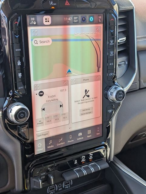 Well equipped with: Bed Utility Group (Exterior 115V AC Outlet, MOPAR 4 Adjustable Cargo Tie-Down Hooks, and MOPAR Spray in Bedliner), Laramie Level 1 Equipment Group (Rain Sensitive Windshield Wipers and Remote Tailgate Release), Quick Order Package 27H Laramie, 10 Speakers, 4-Wheel Disc Brakes, 4G LTE Wi-Fi Hot Spot, ABS brakes, Active Noise Control System, Adjustable pedals, Air Conditioning, Alloy wheels, AM/FM radio: SiriusXM with 360L, Apple CarPlay/Android Auto, Audio memory, Auto High-beam Headlights, Auto Power-Folding Mirrors, Auto-dimming door mirrors, Auto-Dimming Exterior Driver Mirror, Auto-dimming Rear-View mirror, Automatic temperature control, Brake assist, Bumpers: chrome, Chrome Exterior Mirrors, Compass, Connected Travel and Traffic Services, Connectivity - US/Canada, Convex Wide-Angle Exterior Mirror Insert, Delay-off headlights, Driver door bin, Driver vanity mirror, Dual front impact airbags, Dual front side impact airbags, Electronic Stability Control, Exterior Mirrors Courtesy Lamps, Exterior Mirrors with Heating Element, Exterior Mirrors with Memory, Exterior Mirrors with Supplemental Signals, Front anti-roll bar, Front Bucket Seats, Front Center Armrest w/Storage, Front dual zone A/C, Front fog lights, Front reading lights, Front wheel independent suspension, Fully automatic headlights, Garage door transmitter, GPS Navigation, Heated door mirrors, Heated front seats, Heated rear seats, Heated steering wheel, Illuminated entry, Integrated Center Stack Radio, Integrated Voice Command with Bluetooth®, Leather steering wheel, Leather Trimmed Bucket Seats, Low tire pressure warning, Memory seat, MyFlexCare Service Plan, Navigation System, Occupant sensing airbag, Off-Road Information Pages, Outside temperature display, Overhead airbag, Overhead console, Panic alarm, ParkView Rear Back-Up Camera, Passenger door bin, Passenger vanity mirror, Pedal memory, Power door mirrors, Power driver seat, Power passenger seat, Power steering, Power windows, Radio data system, Radio: Uconnect 5 Navigation with 12.0 Display, RAM Grille Badge - Chrome, RamBox Cargo Management System, Rear anti-roll bar, Rear reading lights, Rear seat center armrest, Rear step bumper, Remote keyless entry, Security system, SiriusXM Radio Service, SiriusXM with 360L, Speed control, Split folding rear seat, Steering wheel mounted audio controls, Tachometer, Telescoping steering wheel, Tilt steering wheel, Traction control, Trailer Brake Control, Trip computer, Turn signal indicator mirrors, USB Host Flip, Variably intermittent wipers, Ventilated front seats, Voltmeter, and Wheels: 20 x 9 Premium Paint/Polish. Price includes: $1000 - 2026 National Bonus Cash . Exp. 03/31/2026 $3500 - 2026 National Retail Consumer Cash . Exp. 03/31/2026 $750 - 2026 Southeast BC Retail Bonus Cash. Exp. 03/31/2026