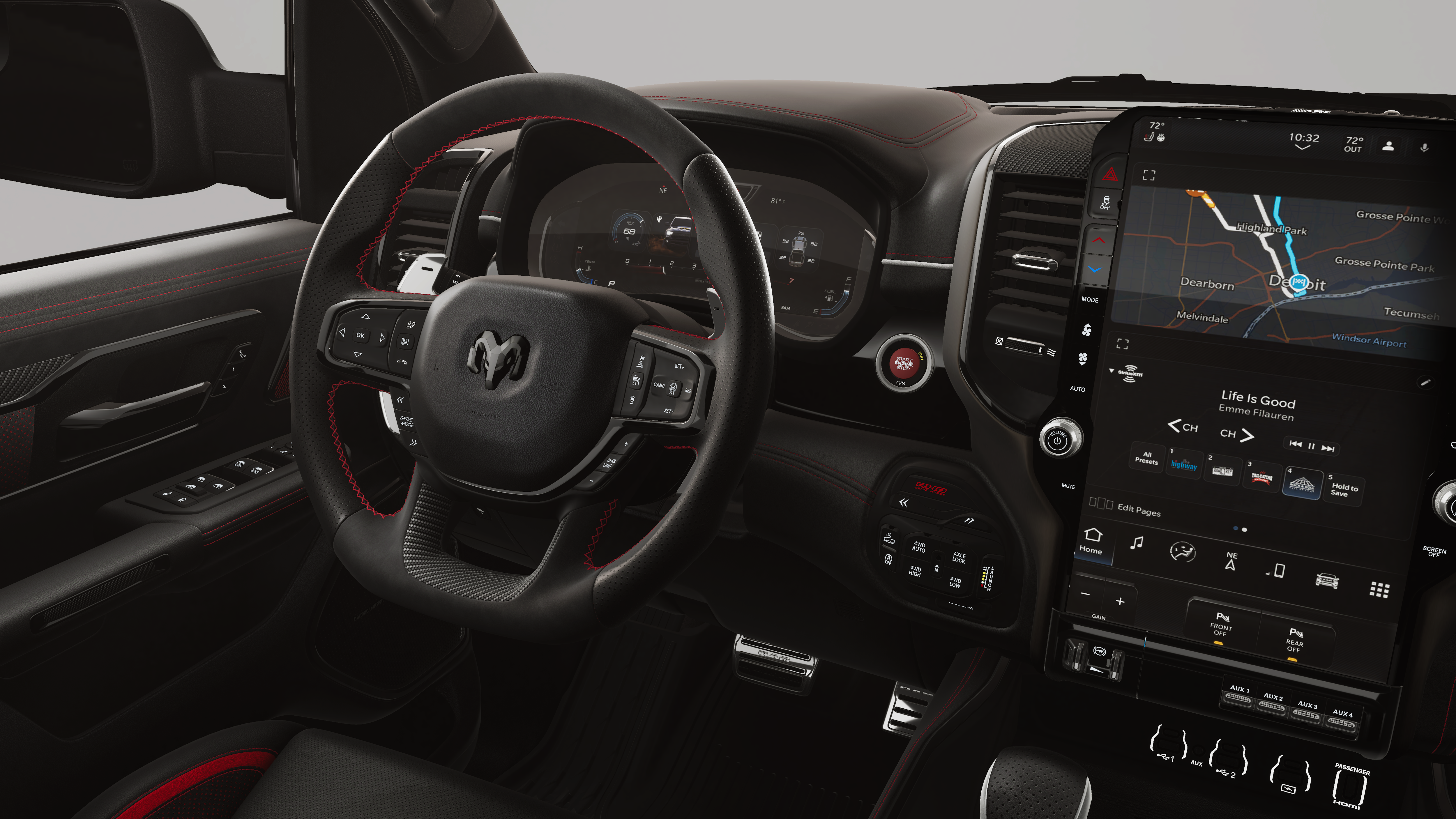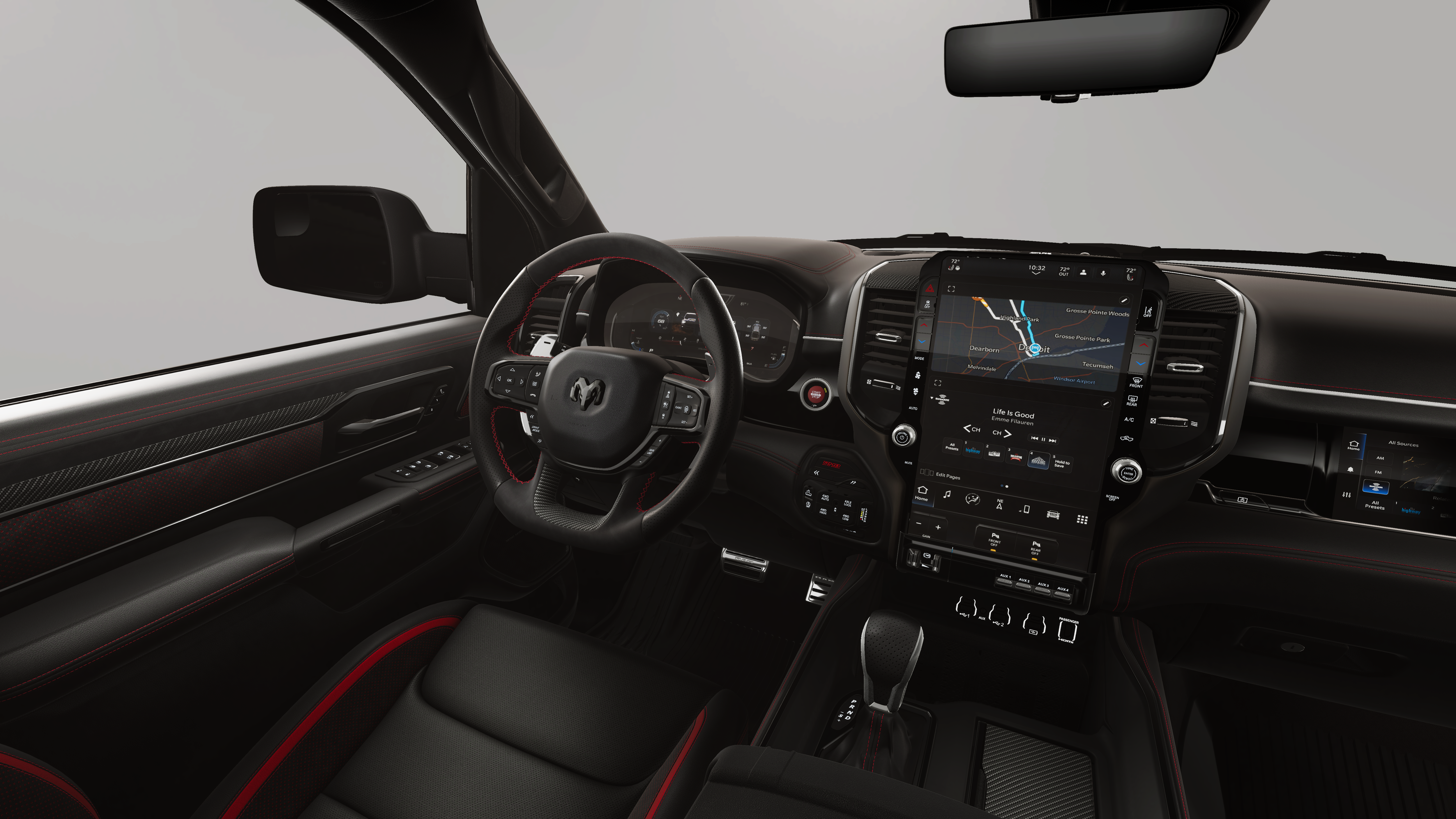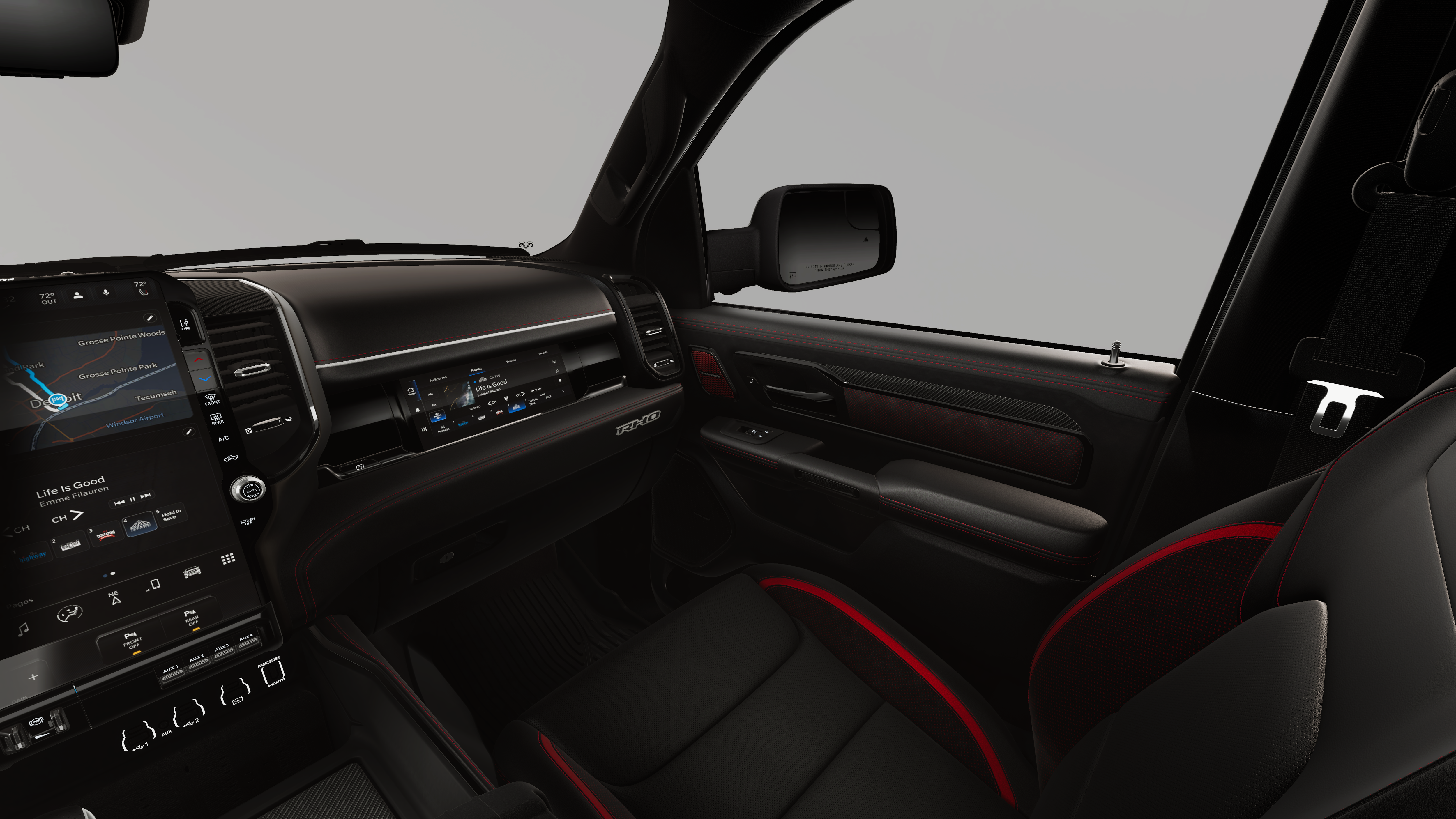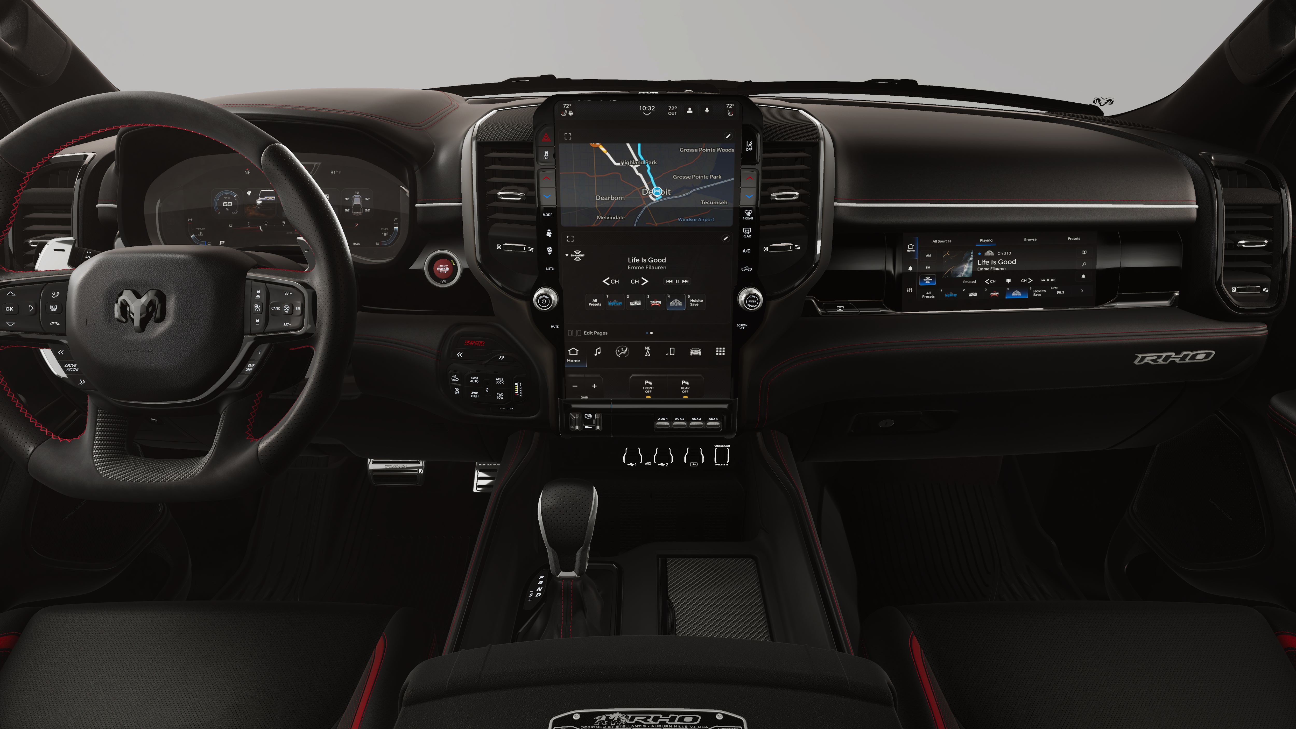 Bright White Clearcoat 2026 Ram 1500 RHO 4WD 8-Speed Automatic 3.0L I6 10 Speakers, 12-Way/1-Way Trailer Connector, 14.4 Touchscreen Display, 240 Amp Alternator, 3.92 Rear Axle Ratio, 4-Wheel Disc Brakes, 4G LTE Wi-Fi Hot Spot, ABS brakes, Adaptive suspension, Adjustable pedals, Air Conditioning, Alloy wheels, AM/FM radio, Apple CarPlay/Android Auto, Auto High-beam Headlights, Auto Power-Folding Mirrors, Auto-dimming door mirrors, Auto-Dimming Exterior Driver Mirror, Auto-dimming Rear-View mirror, Automatic temperature control, Brake assist, Compass, Connected Travel and Traffic Services, Connectivity - US/Canada, Delay-off headlights, Disassociated Touchscreen Display, Dome Dual LED Reading Lamp, Driver door bin, Driver Power Seat Back Massage, Driver Seat Memory, Driver vanity mirror, Driver/Passenger Wrapped Assist Handles, Drowsy Driver Detection, Dual front impact airbags, Dual front side impact airbags, Dual Wireless Charging Pad, Dual-Pane Panoramic Sunroof, Electronic Stability Control, Evasive Steer Assist, Exterior Mirrors Courtesy Lamps, Exterior Mirrors with Heating Element, Exterior Mirrors with Memory, Exterior Mirrors with Supplemental Signals, Exterior Parking Camera Rear, Flareside Box, Front anti-roll bar, Front Bucket Seats, Front Center Armrest w/Storage, Front dual zone A/C, Front fog lights, Front License Plate Bracket, Front Passenger Interactive Display, Front Passenger Power Seat Back Massage, Front reading lights, Front wheel independent suspension, Full Length Premium Upgraded Floor Console, Fully automatic headlights, Garage door transmitter, GPS Navigation, Hands-Free Active Driving Assist System, Harman/Kardon 19 Speaker Premium Sound, HD Radio, Heads-Up Display, Heated door mirrors, Heated front seats, Heated Second Row Seats, Heated steering wheel, Illuminated entry, Integrated Center Stack Radio, Integrated Voice Command with Bluetooth®, Intersection Collision Assist System, Leather Shift Knob, Leather steering wheel, Leather Trimmed Bucket Seats, Leather/Carbon Flat-Bottom Steering Wheel, LED CHMSL Lamp, Low tire pressure warning, Luxury Front Door Trim Panel, MOPAR Off-Road Style Running Boards, MOPAR RHO Exterior Graphics, MyFlexCare Service Plan, Navigation System, Occupant sensing airbag, Outside temperature display, Overhead airbag, Overhead console, Panic alarm, Passenger door bin, Passenger vanity mirror, Power Adjustable Pedals with Memory, Power door mirrors, Power driver seat, Power passenger seat, Power steering, Power Tailgate, Power windows, Premium Wrapped Instrument Panel Bezel, Quick Order Package 22Y RHO, Radio data system, Radio: Uconnect 5 Nav with 14.4 Display, Radio: Uconnect 5 Navigation with 12.0 Display, Radio/Driver Seat/Mirrors/Pedals Memory, Rain Sensitive Windshield Wipers, Real Carbon Fiber Interior Accents, Rear 60/40 Folding Split Recline Seat, Rear reading lights, Rear seat center armrest, Rear step bumper, Rear window defroster, Red Interior Accents, Remote keyless entry, RHO Level 1 Equipment Group, Security system, SiriusXM Radio Service, Smartphone as a Key Capable, Speed control, Split folding rear seat, Sport steering wheel, Steering wheel mounted audio controls, Surround View Camera System, Tachometer, Telescoping steering wheel, Tilt steering wheel, Traction control, Traffic Sign Recognition, Tri-Fold Tonneau Cover, Trip computer, Turn signal indicator mirrors, USB Host Flip, Variably intermittent wipers, Ventilated Front Seats, Ventilated Rear Seats, Voltmeter, Wheels: 18 x 9 Bead-Lock Aluminum, Wheels: 18 x 9 Black Paint/Polish Aluminum.