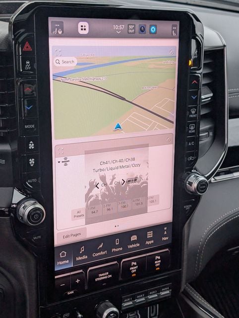 Well equipped with: Quick Order Package 22Y RHO, RHO Level 1 Equipment Group (12-Way/1-Way Trailer Connector, 14.4 Touchscreen Display, 240 Amp Alternator, 4G LTE Wi-Fi Hot Spot, Connected Travel and Traffic Services, Connectivity - US/Canada, Disassociated Touchscreen Display, Driver Power Seat Back Massage, Driver Seat Memory, Driver/Passenger Wrapped Assist Handles, Drowsy Driver Detection, Dual Wireless Charging Pad, Evasive Steer Assist, Exterior Mirrors with Memory, Front Passenger Interactive Display, Front Passenger Power Seat Back Massage, Full Length Premium Upgraded Floor Console, GPS Navigation, Hands-Free Active Driving Assist System, Harman/Kardon 19 Speaker Premium Sound, HD Radio, Heads-Up Display, Heated Second Row Seats, Integrated Center Stack Radio, Integrated Voice Command with Bluetooth®, Intersection Collision Assist System, Leather/Carbon Flat-Bottom Steering Wheel, LED CHMSL Lamp, Luxury Front Door Trim Panel, Power Adjustable Pedals with Memory, Power Tailgate, Premium Wrapped Instrument Panel Bezel, Radio: Uconnect 5 Nav with 14.4 Display, Radio/Driver Seat/Mirrors/Pedals Memory, Rain Sensitive Windshield Wipers, Real Carbon Fiber Interior Accents, Rear 60/40 Folding Split Recline Seat, SiriusXM Radio Service, Smartphone as a Key Capable, Surround View Camera System, Traffic Sign Recognition, USB Host Flip, Ventilated Front Seats, and Ventilated Rear Seats), Towing Technology Group (Trailer Hitch Line-Up Assist and Trailer Reverse Guidance), Trailer Tow Group (Trailer Reverse Steering Control and Trailer Tire Pressure Monitoring System), 10 Speakers, 3.92 Rear Axle Ratio, 4-Wheel Disc Brakes, ABS brakes, Adaptive suspension, Adjustable pedals, Air Conditioning, Alloy wheels, AM/FM radio, Apple CarPlay/Android Auto, Auto High-beam Headlights, Auto Power-Folding Mirrors, Auto-dimming door mirrors, Auto-Dimming Exterior Driver Mirror, Auto-Dimming Exterior Passenger Mirror, Auto-dimming Rear-View mirror, Automatic temperature control, Black Exterior Mirrors, Black Power-Fold Trailer Tow Mirrors, Brake assist, Compass, Delay-off headlights, Dome Dual LED Reading Lamp, Driver door bin, Driver vanity mirror, Dual front impact airbags, Dual front side impact airbags, Dual-Pane Panoramic Sunroof, Electronic Stability Control, Exterior Mirrors Courtesy Lamps, Exterior Mirrors with Heating Element, Exterior Mirrors with Supplemental Signals, Exterior Parking Camera Rear, Flareside Box, Forward and Reverse Utility Lights, Front anti-roll bar, Front Bucket Seats, Front Center Armrest w/Storage, Front dual zone A/C, Front fog lights, Front License Plate Bracket, Front reading lights, Front wheel independent suspension, Fully automatic headlights, Garage door transmitter, Heated door mirrors, Heated front seats, Heated steering wheel, Illuminated entry, Leather Shift Knob, Leather steering wheel, Leather Trimmed Bucket Seats, Low tire pressure warning, Mirror Clearance/Running Lights, MyFlexCare Service Plan, Navigation System, Occupant sensing airbag, Outside temperature display, Overhead airbag, Overhead console, Panic alarm, Passenger door bin, Passenger vanity mirror, Power door mirrors, Power driver seat, Power passenger seat, Power steering, Power Telescoping Mirrors, Power windows, Power-Adjustable Convex Aux Mirrors, Radio data system, Radio: Uconnect 5 Navigation with 12.0 Display, Rear reading lights, Rear seat center armrest, Rear step bumper, Rear window defroster, Remote keyless entry, Security system, Speed control, Split folding rear seat, Sport steering wheel, Steering wheel mounted audio controls, Tachometer, Telescoping steering wheel, Tilt steering wheel,