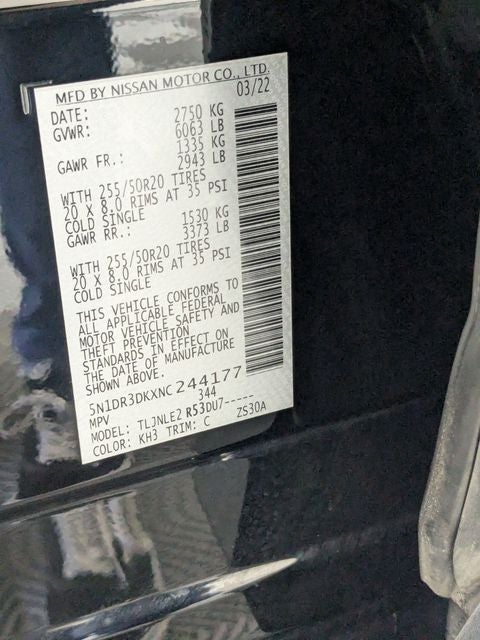 4WD, 13 Speakers, 3rd row seats: bench, 4-Wheel Disc Brakes, ABS brakes, Air Conditioning, Alloy wheels, AM/FM radio: SiriusXM, Auto High-beam Headlights, Auto tilt-away steering wheel, Auto-dimming Rear-View mirror, Automatic temperature control, Axle Ratio: TBD, Black Splash Guards (Set of 4), Bodyside moldings, Bose Premium Audio System, Brake assist, Bumpers: body-color, Captain's Chairs Carpeted Floor Mats (Set of 4), Cargo Area Protector, Cargo Net, Cargo Package, Climate Controlled Front Bucket Seats, Cross Bars, Delay-off headlights, Driver door bin, Driver vanity mirror, Dual front impact airbags, Dual front side impact airbags, Electronic Stability Control, Emergency communication system: NissanConnect Services, Exterior Parking Camera Rear, First Aid Kit, Four wheel independent suspension, Front anti-roll bar, Front Bucket Seats, Front Center Armrest, Front dual zone A/C, Front fog lights, Front reading lights, Fully automatic headlights, Garage door transmitter: HomeLink, Heads-Up Display, Heated door mirrors, Heated front seats, Heated rear seats, Heated steering wheel, Illuminated entry, Knee airbag, Leather steering wheel, Low tire pressure warning, Memory seat, Navigation system: NissanConnect Navigation, NissanConnect w/Navigation & Services, Occupant sensing airbag, Outside temperature display, Overhead airbag, Overhead console, Panic alarm, Passenger door bin, Passenger vanity mirror, Power door mirrors, Power driver seat, Power Liftgate, Power moonroof, Power passenger seat, Power steering, Power windows, Radio data system, Radio: AM/FM Audio System, Rain sensing wipers, Rear air conditioning, Rear anti-roll bar, Rear reading lights, Rear side impact airbag, Rear window defroster, Rear window wiper, Reclining 3rd row seat, Remote keyless entry, Running Boards, Security system, Semi-Aniline Leather Seating Surfaces, Speed control, Speed-sensing steering, Speed-Sensitive Wipers, Split folding rear seat, Spoiler, Steering wheel memory, Steering wheel mounted audio controls, Tachometer, Telescoping steering wheel, Tilt steering wheel, Traction control, Trip computer, Turn signal indicator mirrors, Variably intermittent wipers, Ventilated front seats, Wheels: 20 Alloy w/Unique Finish, 4WD. Super Black 2022 Nissan Pathfinder Platinum 4WD 9-Speed Automatic V6 20/25 City/Highway MPG